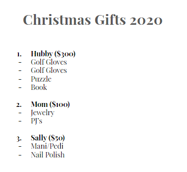 Decide what people your family is purchasing gifts for. Write their names down with the amount you are spending next to their name. This will automatically show you how much money you are allocating towards gifts. If you need to budget, you can easily make a plan. If not, you are just more aware of what you are actually spending on gifts. Under their name write any ideas you have for them or what you are wanting to purchase.