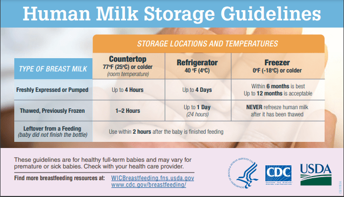 Knowing how you are going to store your milk when you travel or work eliminates another stress and prevents potentially wasting any milk. When I worked I would store my milk in a mini fridge (inside a cooler) that was in our conference room, however it really just depends on the situation. Also keep in mind the recommendations shown below!