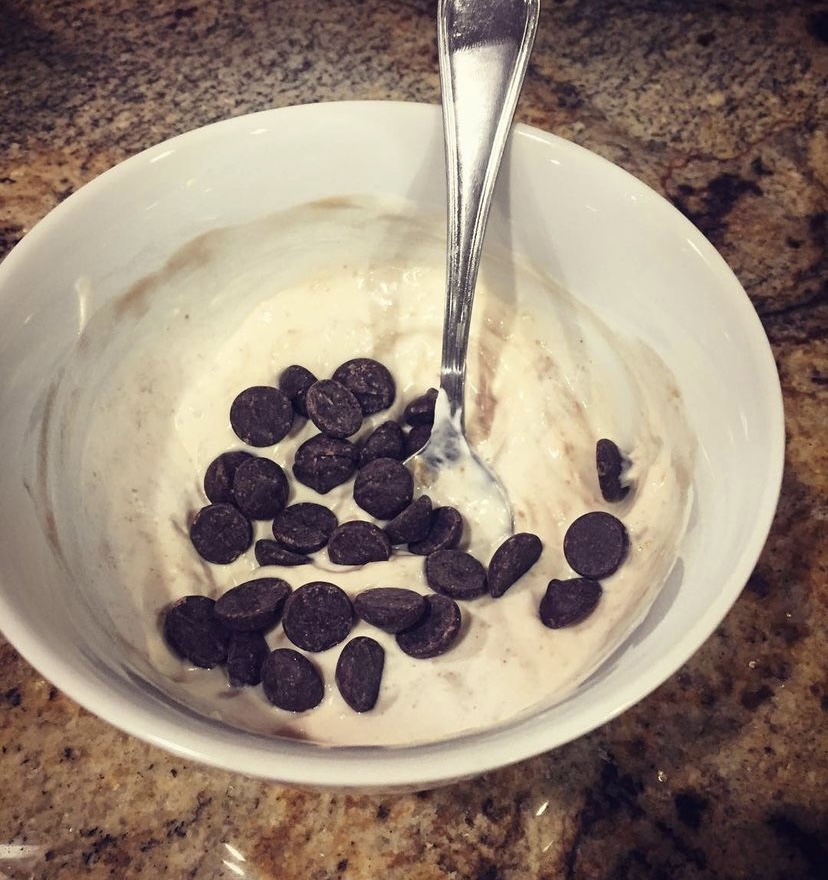 I use vanilla Greek yogurt (about 1/2 cup), 1 spoon of peanut butter, drizzle honey, sea salt, handful of chocolate chips.